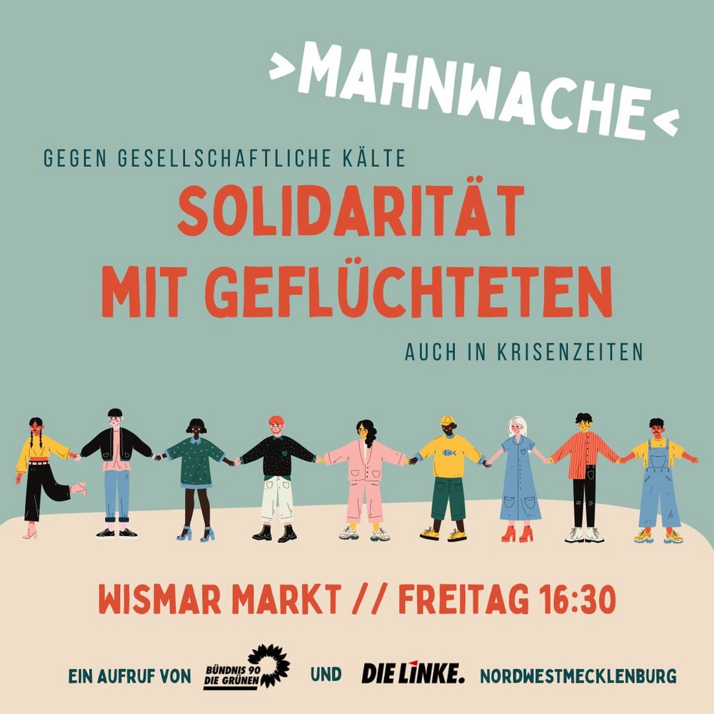 Die LINKE Nordwestmecklenburg und der Kreisverband Bündnis 90/Die Grünen veranstalten am 21.10.2022 von 16.30 Uhr bis 18.00 Uhr eine Mahnwache um Solidarität mit Geflüchteten Menschen zu zeigen. Bei dieser Mahnwachen schenken wir symbolisch Kaffee und Tee aus und bieten die Möglichkeit miteinander ins Gespräch zu kommen um diese Solidarität zum Ausdruck zu bringen.