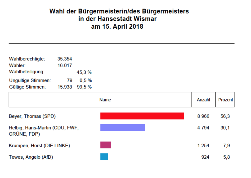 Wir gratulieren dem Amtsinhaber und neuen Bürgermeister Thomas Beyer und erwarten von ihm eine stärkere Einbeziehung von BürgerInnen und VertreterInnen der anderen Parteien als bisher. Leider hat das schlechte Abschneiden insbesondere der Linken eine Stichwahl verhindert, die es unserem Kandidaten ermöglicht hätte, sich vom Amtsinhaber in direkter Konfrontation absetzen zu können. Denn anders als Thoms Beyer steht Hans-Martin Helbig für ein ausgleichendes Miteinander im Interesse der Stadtentwicklung.