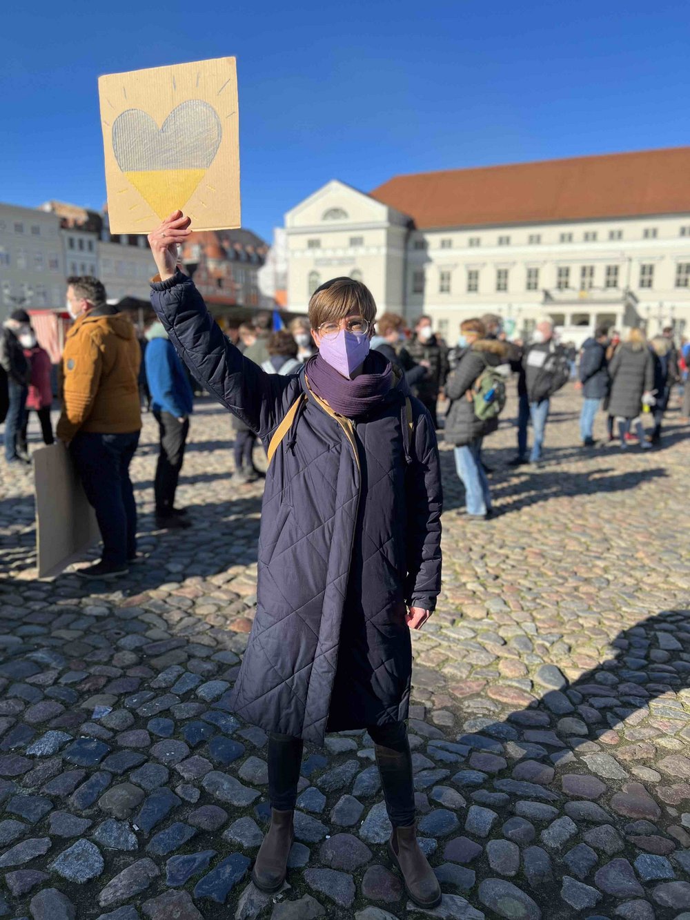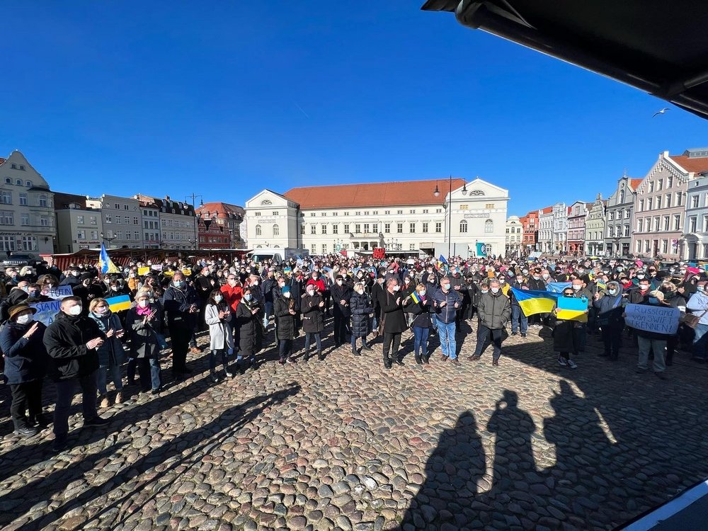 Zusammen mit den anderen demokratischen Partein haben wir zu einer Solidaritätsdemo für die Ukraine aufgerufen. Über 450 Menschen sind heute dem gefolgt. Alle eint, dass dieser Krieg umgehend gestoppt werden muss und Russland alle seine Truppen aus der Ukraine sofort abziehen muss. Bürgermeister, Landrat und Vertreter*innen der Parteien zeigten große Einigkeit und verurteilten den Angrffskrieg von Putin. Besondern berührend waren die Reden der in WIsmar lebenden Ukrainer*innen, die sehr emotional und bildlich ihre Situation, die ihrer Familien und von Freunden in der Ukraine schilderten. Sie bedankten Sie für dich deutsche Unterstützung, haben aber auch klar mehr Hilfe von Deutschland und Europa für die Ukraine eingefordert.