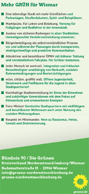"Wismar braucht eine qualifizierte und frühzeitige Bürgerbeteiligung in der Stadtentwicklung, Flächenangebote für Familien, Genossenschaften und Baugruppen, den Ersatz der Hochbrücke als Trog- bzw. Tunnellösung und die Erhaltung der Naturräume."