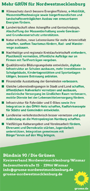 Am 26. Mai 2019 findet die Kommunalwahl statt. Im Rahmen dieser Wahl werden der Kreistag, die Wismarer Bürgerschaft, alle Gemeindevertretungen und die ehrenamtlichen Bürgermeister neu gewählt. Als Grüne wollen wir in unserer Region mehr bewegen! Wir lieben und kennen das Land und wollen deshalb in die Zukunft unseres Landes investieren: in moderne Mobilität, gute Bildung, Neue Energien und Chancen für die ländlichen Räume.